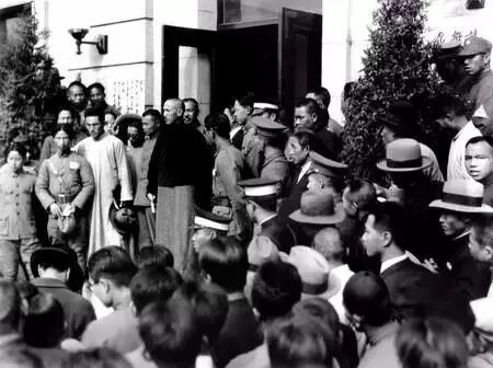 1934年1月,学生包围国民党中央党部,要求与蒋介石对话,身穿马褂的蒋介石出面与学生们对话。