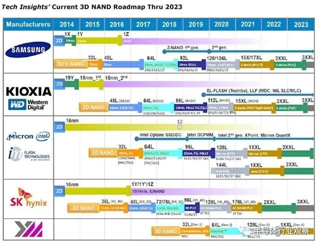 从TechInsights闪存路线图中获悉,2D NAND闪存以工艺制程演进为评判标准,而迈入3D NAND之后,工艺制程演进相对缓慢,堆叠层数取代工艺制程成为新的介质进化标准。