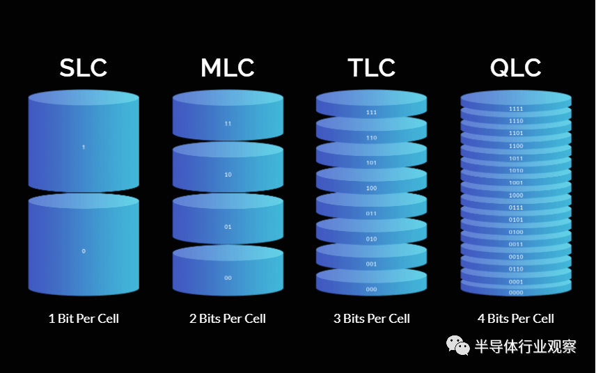 首先来了解一下cell的种类,按照每个cell能存储的bit数分为SLC、MLC、TLC和QLC几种。