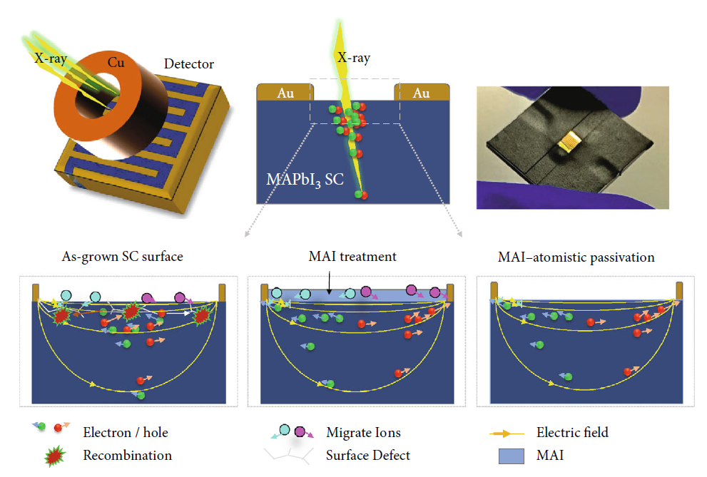 吉林大学董庆锋教授团队和浙江大学杨德仁院士课题组的方彦俊研究员团队制备出如图1所示的共平面结构MAPbI3单晶X射线探测器,并利用碘甲胺(MAI)在MAPbI3单晶表面的可控自组装过程钝化了其表面缺陷。