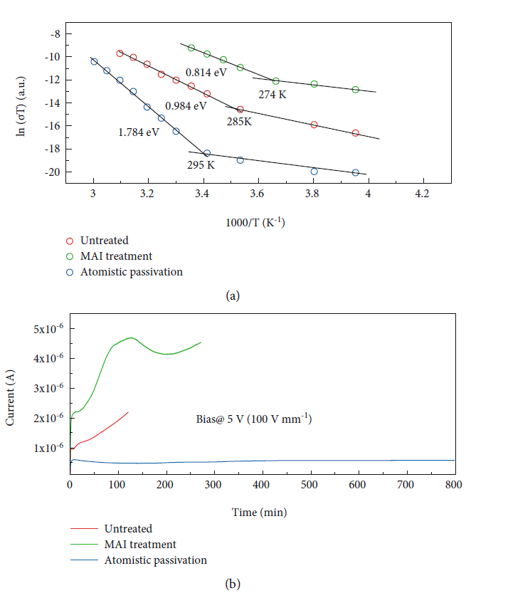 但是过量的MAI会留在晶体表面,形成可移动的离子,使得离子迁移激活能降低,离子移动效应增强。因此我们进一步将晶体表面残留的未成键的MAI洗掉,从而得到了不含有过量MAI的完美钝化层。表面缺陷进一步被抑制,荧光寿命更长;同时离子迁移激活能有了很大提升。在长时间施加偏压下暗电流更稳定,几乎不漂移。(图3)