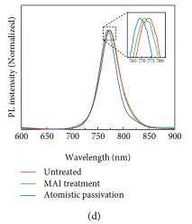 对于未做任何处理的单晶,表面具有大量金属铅缺陷;当使用MAI进行钝化时,金属铅缺陷被消除,表面缺陷密度降低,荧光峰有一定蓝移,荧光寿命变长(图2)。