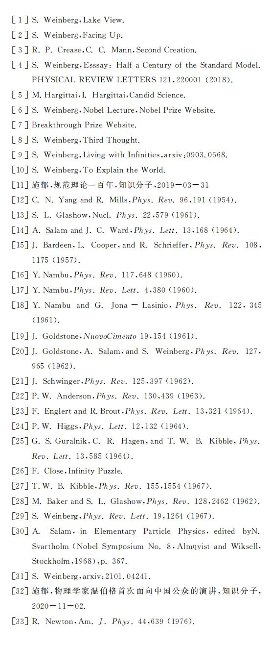 我2010年至2011年在德克萨斯大学奥斯特分校访问(在牛谦教授组里)。在这期间旁听了温伯格教授的“量子场论选题”和“量子力学”两门课,并向他请教过若干问题。记得他课后坐电梯时也象其他人一样看看手机。有一次他向我提到,不知道量子力学的光学定理有什么参考文献,我很快查到Roger Newton在American Journal of Physics 上的一篇综述[33],发给了他。我曾经问他一个广义相对论的问题,他回答后,指出可以在他的《引力论和宇宙论》里找到有关讨论。温伯格教授还主动送给我当时出版不久的 Lake View,并签了名。他告诉我,他仅在1978年访问过中国,大概是由李政道先生引荐。