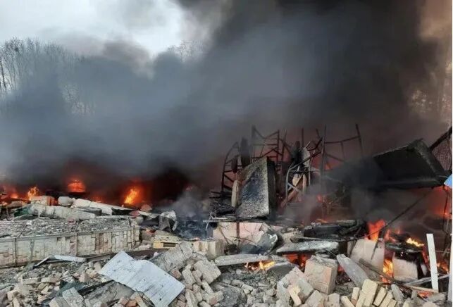 乌克兰国民卫队司令部被炸毁,浓烟密布,火光照亮天际。