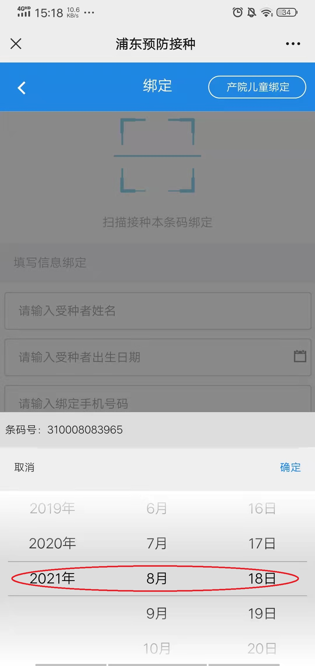 ④扫接种证上“31000......”开头的条形码进行绑定