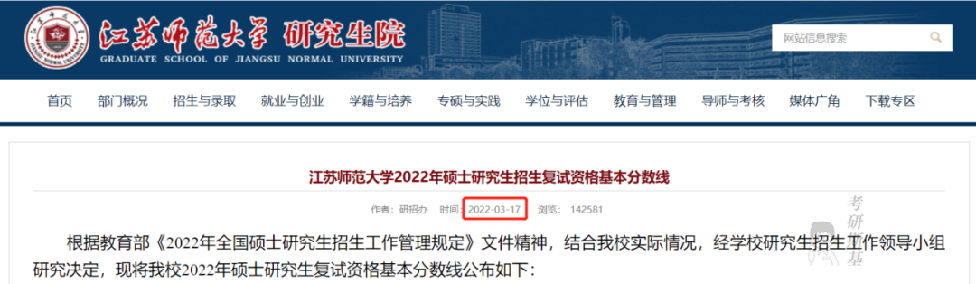 2022年考研,江苏师范大学在3月17日公布了本校的复试分数线,公布时间也算是比较早的。