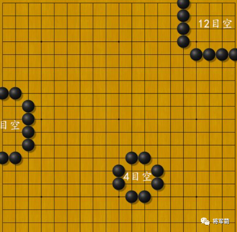 一方面,“金角银边草肚皮”的棋理表明,角部的围空效率最高。例如同样是8颗棋子,在中央仅能围4目的实地,而边上和角部可以围出: