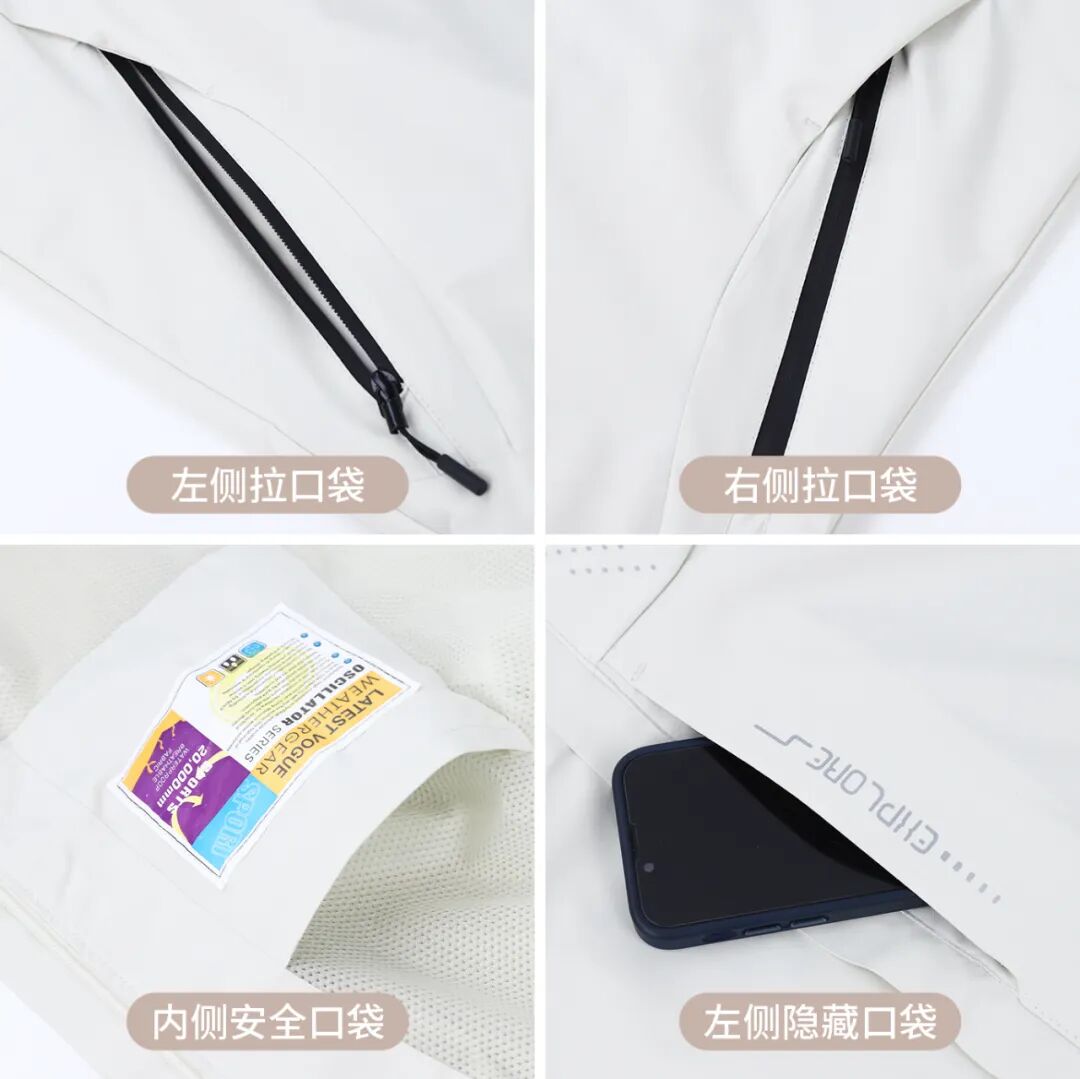 全衣一共4个口袋,剔除内侧的安全口袋,其余都是拉链设计,可以装下很多随身用品,就是穿着跑步也不怕东西掉出来。