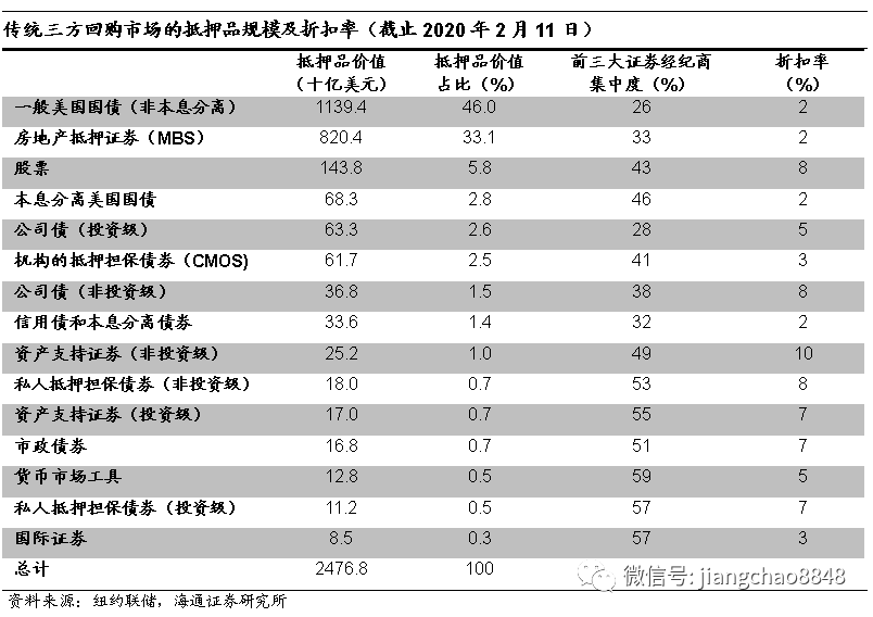 回购市场抵押品中,国债、MBS占比较高。以传统三方回购市场为例,其抵押品包括美国国债、ABS、MBS、公司债、市政债券、股票和货币市场工具等。截至2020年2月11日,传统的三方回购市场抵押品规模接近2.5万亿美元,是一般担保品回购市场抵押品价值规模的5倍左右。其中占比较高的是美国国债(占比46%)和房地产抵押债券(MBS,占比33%)。而从折扣率来看,国债和MBS的折扣率较低,非投资级的ABS、股票、公司债的折扣率较高。