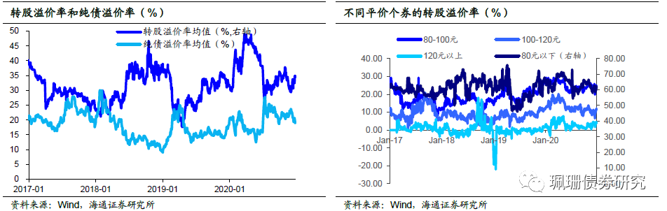 其中平价80元以下转债的转股溢价率均值61.37%,环比提升1.04个百分点;80-100元转债的转股溢价率均值24.59%,环比压缩1.14个百分点;100-120元转债的转股溢价率均值11.34%,环比提升1.25个百分点;而平价120元以上转债的转股溢价率均值3.69%,环比压缩0.23个百分点。