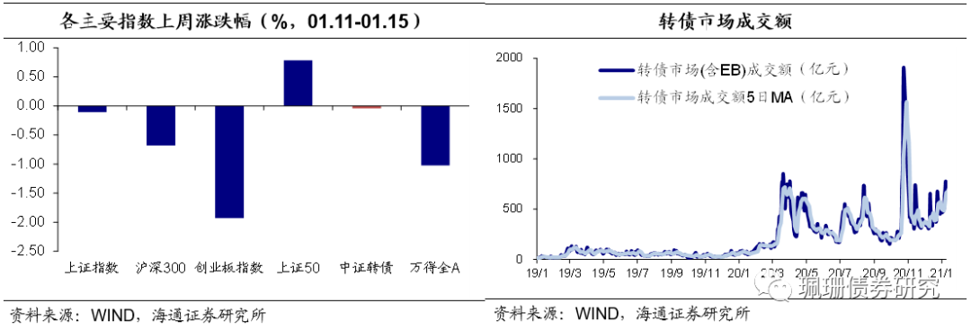 上周中证转债指数下跌0.04%,周日均成交量(包含EB)547.98亿元,环比下降17.38%,我们计算的转债全样本指数(包含公募EB)下跌0.02%。同期沪深300指数下跌0.68%、创业板指下跌1.93%、上证50上涨0.78%。