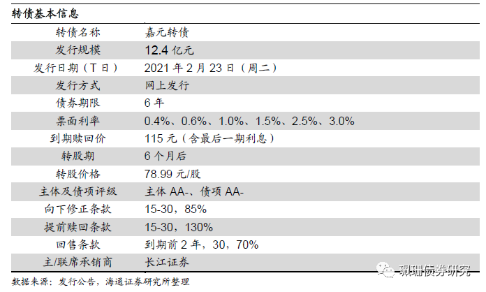 嘉元转债发行规模12.4亿元,期限6年,评级AA-,网上发行,网上申购日为2月23日(周二、T日)。转债初始平价103.05元(按2月22日收盘价计算),债底81.87元,纯债YTM3.29%。下修条款(15-30,85%)、赎回条款(15-30,130%),回售条款(30,70%),整体看债底保护不高,条款保持主流模式。申购方面我们预计中签率0.007%-0.009%左右,上市价格113-116元左右。嘉元转债为科创板的首只转债,我们认为股价不出现大幅波动的情况下,转债上市破面的风险不大,一级申购可积极关注。