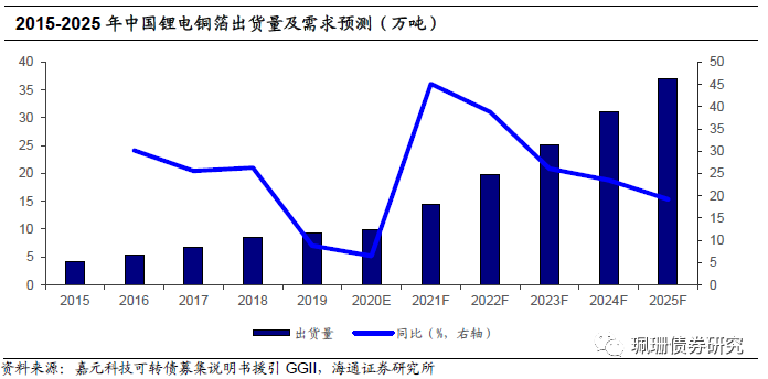 未来动力电池出货量增长将带动中国锂电铜箔市场发展。新能源汽车、3C 数码领域以及规模储能市场的发展,带动锂电池市场需求持续增长,政策方面,国家已出台多项政策鼓励锂电池及关键材料发展,根据嘉元科技可转债募集说明书援引高工产研锂电研究所(GGII)数据,根据GGII预测,到2025年全球锂电池出货量有望达到 1040GWh,未来五年国内市场整体增速可达25%-50%,到2025年中国锂电池出货量将达565.1GWh,作为锂电池负极核心材料,根据GGII预计,到2025 年中国锂电铜箔市场需求将达37.0万吨,未来五年CAGR为30.2%。