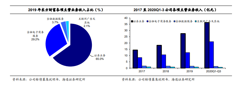 公司是国内领先的互联网服务平台综合运营商,其以“东方财富网”为核心的互联网服务大平台已成为我国用户访问量最大、用户黏性最高的互联网服务平台之一,具有较强的用户资源优势。公司经纪业务快速增长,预计20年增速优于行业,可转债发行后也将助力两融业务发展,市占率也有望加速增长。代销业务方面,天天基金的基金代销数量在代销机构中依然领跑,而金融电子商务服务业毛利率近几年在公司分项业务中相对较高,贡献整体盈利。此外,未来随着基金产品种类的丰富,基金管理业务有望增厚公司业绩。