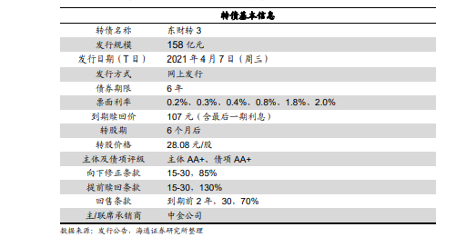 债底保护尚可。东财转3发行规模158亿元,期限6年,主体信用评级为AA+,债项信用评级为AA+。票面利率:第一年为0.2%、第二年为0.3%、第三年为0.4%、第四年为0.8%、第五年为1.8%、第六年为2.0%,到期赎回价107元。按照4月2日同等级企业债收益率计算,对应债底87.0元,纯债到期收益率为1.696%,债底保护性尚可。
