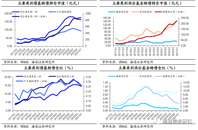 持仓增加但仓位继续小幅下降。一季度公募基金转债持仓为1616亿元,相比20Q4增加103亿元,增速环比有提升,其中混合基金增持较多。转债持仓占基金净值的比重继续小幅下降至0.76%(20年四季度末为0.77%),具体来看,除灵活配置及平衡混合型基金外,主要基金类型转债仓位均有所下降。