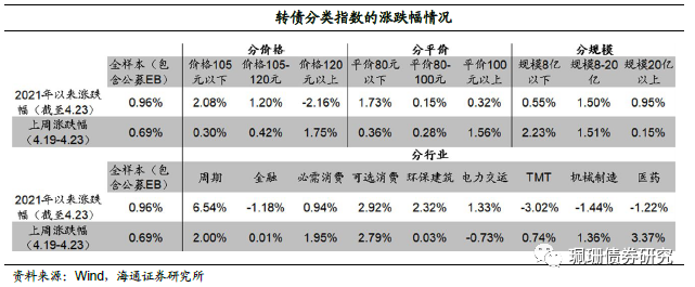 转债指数上涨。上周中证转债指数上涨0.72%,周日均成交量(包含EB)339亿元,环比上涨32.65%,我们计算的转债全样本指数(包含公募EB)上涨0.69%。同期沪深300指数上涨3.41%、创业板指上涨7.58%、上证50上升2.2%,国证2000上涨0.44%。