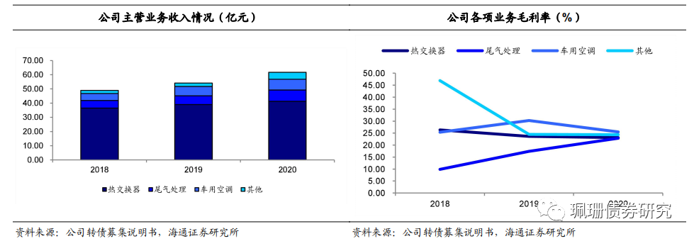 2020年公司实现营收63.24亿元,同比+14.55%,归母净利润3.22亿元,同比+1.23%。去年一季度汽车行业受到疫情影响,随着疫情逐步得到控制,市场逐步复苏。21Q1实现营业收入19.99亿元,同比增长56.84%;归母净利润1.05亿元,同比增长13.05%,除了去年低基数外,商用车及非道路业务继续保持稳健增长,乘用车业务同比增幅较大,其中新能源业务增长幅度尤其明显,但是受到原材料等价格上涨,以及海外订单增加导致的运输费用大幅增加等因素影响,归母净利润增幅不及营收增幅。根据公司20年年报,2021年营业收入目标为73-76 亿元,2022年86-90亿元,2023年为 100-108亿元。公司已在传统商用车、乘用车、工程机械热管理领域建立了较强的竞争优势,在尾气处理行业也已发展多年,具备一定的竞争力,现正逐步开拓新能源乘用车热管理领域。乘用车业务特别是新能源业务,是公司未来重点发力的领域。