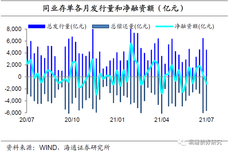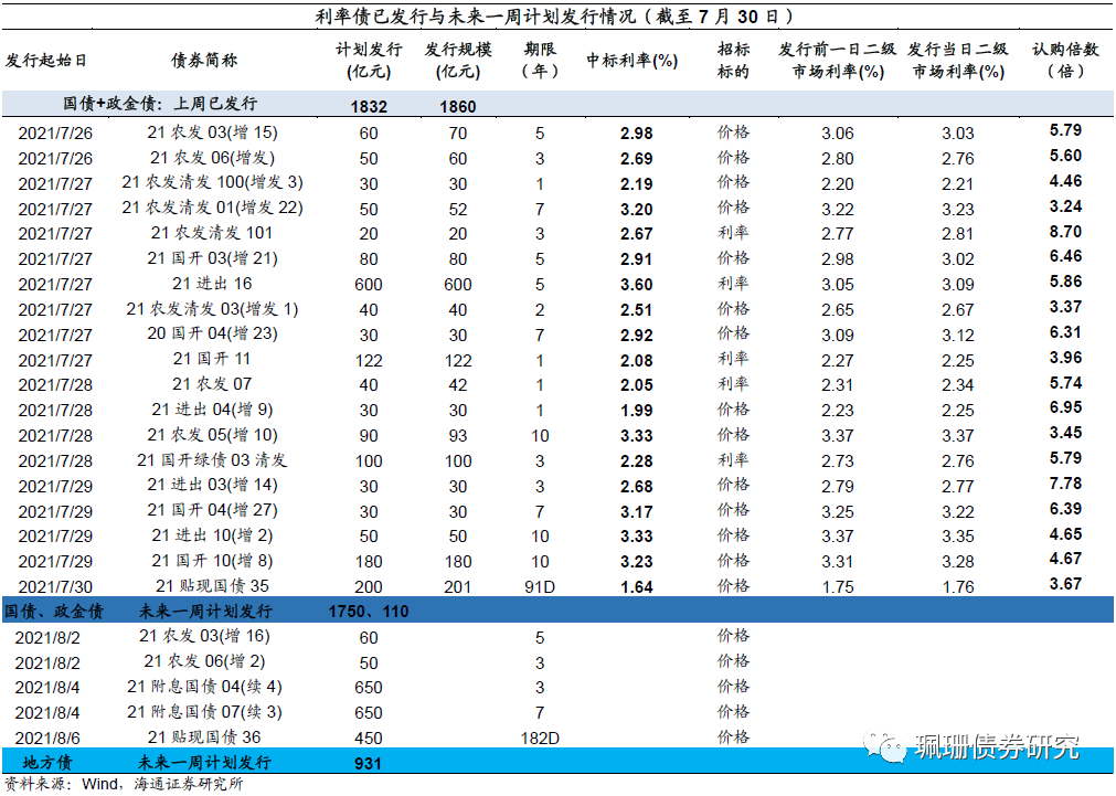 中共中央政治局7月30日召开会议,分析研究当前经济形势,部署下半年经济工作。我们分析政治局会议内容,并展望8月债市的风险和机遇。政治局会议解读之一:稳增长保就业,政府债券发行提速。7月30日的政治局会议对经济的判断删掉了“用好稳增长压力较小的窗口期”,强调外部环境更趋复杂严峻,经济恢复仍然不稳固不均衡,做好毕业生、农民工就业服务。宏观政策方面,删除不急转弯的表述,要“做好今明两年宏观政策衔接”,意味着政策易松难紧。财政政策方面,要求“合理把握预算内投资和地方政府债券发行进度,推动今年底明年初形成实物工作量”,今年以来地方债发行进度始终偏慢,1-7月地方新增专项债总发行规模13535亿元、占政府预期目标的37%,相比于19年~20年节奏明显偏慢,后续政府债券发行有望加快。我们预计8月政府债净供给或高达1.09万亿元,若国债发行缩量、地方债供给部分延后的情况出现、8月供给压力将有所缓解,具体来看:地方债发行执行率大幅回升。今年7月地方债发行执行率已大幅提升至100%,至7月30日,8月已经披露地方供给计划已达10813亿元、按照7月规律(6月末披露规模/实际发行规模),我们预计8月地方债发行量将突破万亿元至1.08万亿元、净发行量6800多亿元。不排除供给延后、发行窗口放宽等情况出现。考虑到8月政府债供给压力大幅回升,我们认为不排除地方债发行部分延后、类似于今年5月,再结合此前财政部部长刘昆表态[2]“适当放宽专项债发行时间限制,合理把握发行节奏”,我们预计今年地方债发行窗口或放宽至年末,发行节奏或更加平滑,且按照目前进度年内发不满的概率偏大。在此假设下,预计8月地方债净发行量5300亿元。国债发行或缩量。国债方面,今年7月1Y~10Y关键期限国债单只发行规模均在700亿元以上,均为今年以来同期限单只最大发行规模,一方面是为了庆祝建党百年,另一方面是7月地方债供给压力小,而8月政府债供给压力大幅回升,预计国债发行有可能缩量,从而缓解债市供给压力、以熨平政府债发行高峰。我们预计8月国债(不含储蓄国债)发行量5600亿元,净发行量4000多亿元。总体而言,政府债券(不含储蓄国债)总发行量在1.5~1.6万亿元、若地方发行有所延后+国债发行缩量、则政府债净发行量为0.93万亿元,反之则政府债净发行量将突破万亿元至1.09万亿元,二者政府债净供给规模均高于今年5月-6月7200多亿元的平均水平,但低于去年同期水平。此外,我们预计今年8月-10月政府债供给压力加大,月净供给规模或均在0.9~1.1万亿元。政治局会议解读之二:确认货币偏松,关注碳减排支持工具。货币政策方面,继续强调保持流动性合理充裕,新增“助力中小企业和困难行业持续恢复”、“增强宏观政策自主性”,意味着下半年流动性将保持平稳偏松,美联储Taper不改变我国货币政策方向,再度降准或推出新的政策工具仍有可能。如央行下半年工作会议提到的碳减排支持工具,为符合条件的金融机构提供低成本资金,为碳减排领域提供优惠利率融资。政治局会议解读之三:落实“领导负责制”。防风险方面,在430会议提出建立“地方主要党政领导负责的财政金融风险处置机制”后,730会议要求落实这一机制,央行下半年工作会议也提出“强化地方党政风险处置属地责任,推动做好重点省份高风险机构数量压降工作”。意味着隐债控制和不发生系统性风险均为政策底线,公募城投债违约风险可控。此外强调房住不炒、促进新能源汽车发展、落实“三孩”生育政策、毫不松懈做好疫情防控。8月债市展望:维持下半年10Y国债利率低点2.75%的判断不变,关注八月供给扰动带来的配置机会。结合政治局会议表态和最新的PMI数据,我们认为下半年经济复苏动能减弱,高频数据显示地产需求继续回落,PMI新订单数据显示出口边际走弱,南京疫情向多省市扩散将进一步扰动消费的恢复,基本面对债市依然偏利多,货币政策易松难紧,后续利率下行的催化包括经济数据回落、货币宽松和信贷回落带动表内资金向债市倾斜。建议久期不宜过短,在8月供给扰动时期关注利率债配置机会,维持十年国债利率区间在2.75%-3.10%的判断。央行净回笼资金3600亿元。7月央行逆回购投放2600亿元,逆回购到期3200亿元;MLF投放1000亿元,到期4000亿元;国库现金定存投放700亿元,到期700亿元;总体来看,央行公开市场净回笼资金3600亿元。受全面降准影响,利率中枢下行。从银行间质押式回购利率来看,7月R001月均值下行9BP至2.04%、R007月均值下行18BP至2.25%;DR001月均值下行3BP至1.99%、DR007月均值下行9BP至2.16%。3M SHIBOR利率下行,3M同业存单发行利率震荡下行。7月利率债净供给为5317亿元,环比减少3428亿元;总发行量18751亿元,环比增加294亿元。其中,国债发行6333亿元,环比增加1269亿元;政策性金融债发行5851亿元,环比增加407亿元;地方政府债发行6568亿元,环比减少1381亿元。截至7月30日,未来一周国债计划发行规模为1750亿元、地方债计划发行规模为931亿元。7月最后一周(7月26日至30日),利率债一级市场招投标需求分化,国债+政金债总计划发行规模1832亿元,实际发行规模1860亿元。国债需求尚可,进出口行债、国开债需求较好,农发债需求一般,具体来说: