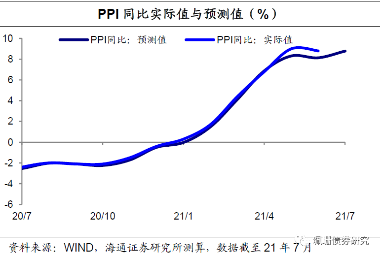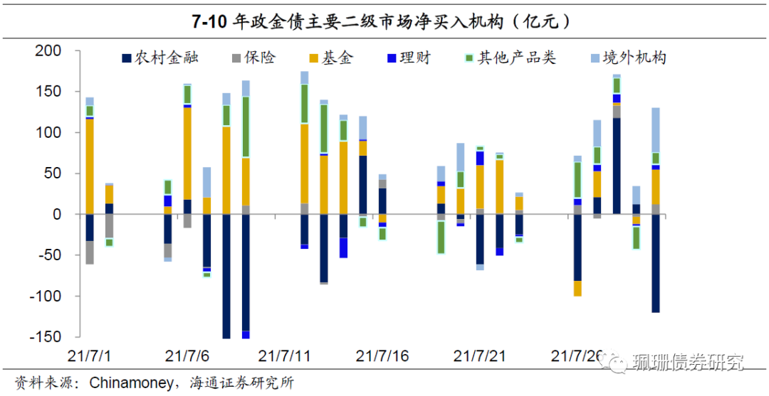 央行全面降准+避险情绪升温=债市大涨。7月中上旬,资金面均衡偏松,虽然经济数据向好并非如预期中的失速下滑(出口表现亮眼,投资整体改善,其中地产投资如期放缓、基建投资增速缓降、制造业投资大幅上行,消费持续修复,工业增加值企稳,服务业相对偏弱),但受月初国常会提及降准、随后央行全面降准等提振债市情绪,债市大幅上涨;中下旬以来,债市供给压力回升,但南京疫情散发+河南洪灾、市场避险情绪上升,叠加资金面平稳,债市延续小牛市行情。7-10年国债主要是境外机构、股份行、外资行在增持,7月净买入额分别为152亿元、93亿元、90亿元,保险买入力度大幅减弱、由6月大额净买入转为7月的净卖出,农商行减持力度加大,基金和券商均转为净买入;7-10年政金债主要是基金、境外机构在增持,其次是其他产品类,其中基金7月边际购买力量大幅增加、理财从6月大幅减持转为7月小幅增持、而农商行由6月大额净买入转为7月大额净卖出、保险也由净买入转为净卖出。1.2基本面判断:PMI连续4个月回落,PPI仍在高位6月社融增速持平,经济稳中向好,确认本轮复苏拐点。6月社融超预期,同比多增2019亿元、主要靠信贷和债券贡献,社融增速持平在11%,M2同比回升至8.6%,社融-M2增速差收窄至2.4%。我们预计下半年社融增速整体小幅下行,但因地方债发行节奏波动或出现部分月份回升情况。经济数据方面,6月出口反弹,投资向好(地产基建降、制造业反弹),消费持续修复,工业增加值略放缓但高于19年同期水平,服务业相对偏弱。二季度GDP同比7.9%、低于市场预期,两年平均增速上行至5.5%,实际GDP环比1.3%、强于一季度,但明显弱于去年Q4的3.0%。总体来看,经济稳中向好,并非预期中的复苏大幅放缓,但确认本轮复苏高点在20Q4。7月PMI继续回落,产需两端均偏弱。7月制造业PMI已连续四个月回落,下降0.5个百分点至50.4%,已不及今年年初水平,高于16年、19年同期水平,低于17年、18年、20年同期水平,预示制造业扩张速度持续放缓、逐渐临近荣枯线。其中产需两端均偏弱,生产指数大幅下降0.9个百分点至51%,新订单指数也回落0.6个百分点,均不及今年年初水平;新出口订单指数也已连续四个月回落、下行0.4个百分点至47.7%,已连续三个月在荣枯线下方,显示我国出口景气度韧性持续消减。