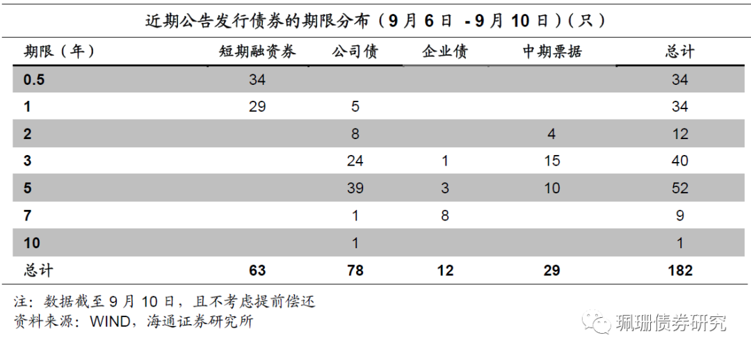 根据Wind统计,本周短融发行625.4亿元,到期1010.9亿元,中票发行350.2亿元,到期425.3亿元;企业债发行98.2亿元,到期80.8亿元;公司债发行627.6亿元,到期541.3亿元。本周主要信用债品种共发行1701.4亿元,到期2058.2亿元,净供给-356.81亿元,较前一个交易周(8月30日-9月3日)的471.32亿元有所减少。从主要发行品种来看,本周共发行短融超短融63只,中期票据29只,公司债发行78只,企业债发行12只,发行数量较前一周有所减少。从发行人资质来看,AAA等级发行人占比最大为62.64%。从行业来看,建筑业发行人占比最大为28.02%,其次为综合类发行人,占比为23.08%。在发行的182只主要品种信用债中,有15只城投债,占比约8.24%,发行数量比上周有所减少。![]()