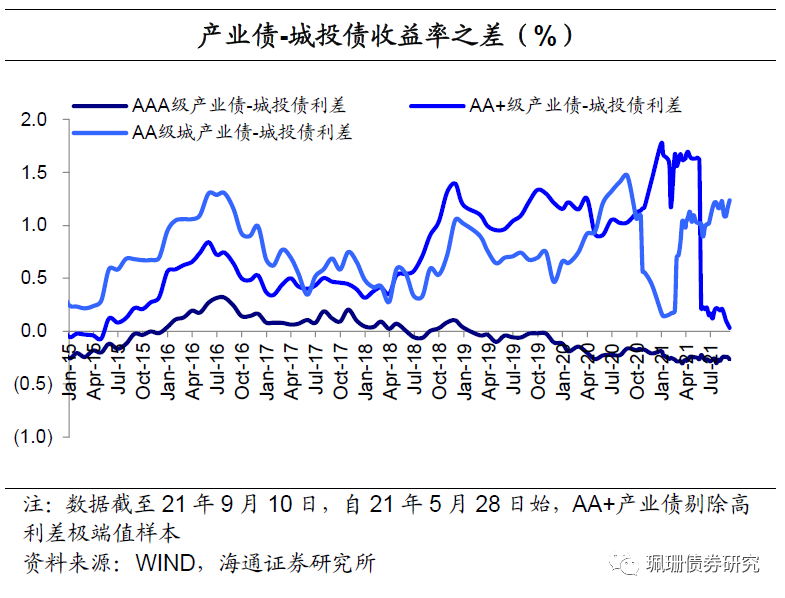 城投债利差收窄或持平。具体来看,截至9月10日,城投债AAA级利差为81BP,较上周末下行1BP;城投债AA+级利差为110BP,与上周末基本持平;城投债AA级利差为197BP,较上周末下行4BP。产业债与城投债利差分化,AA等级城投表现显著好于产业债。具体来看,截至9月10日,本周AAA级产业债-城投债利差目前在-27BP,较上周末下行3BP;AA+级产业债-城投债利差目前在3BP左右,较上周末下行4BP;AA级产业债-城投债利差目前在124BP左右,较上周末上行7BP。![]()