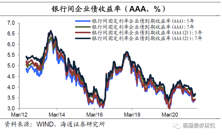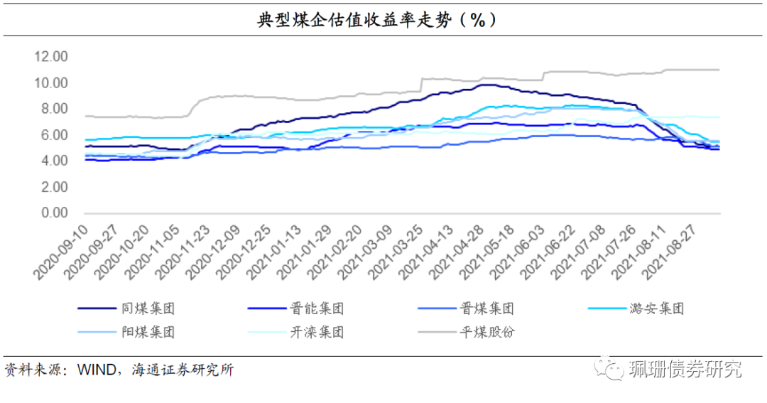 煤炭债收益率走势呈现典型区域性分化。对于煤企而言,永煤违约对于其资本市场债券估值及再融资无疑是最大扰动,从下图七家煤企估值收益率走势来看,受到永煤事件影响,20年11月以来估值持续走高,但是自21年4月以来,山西省属煤企估值下行趋势明显,反观晋外省属煤企估值收益率则居高不下。![]()