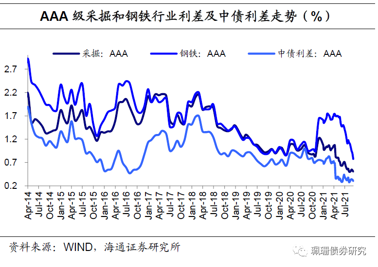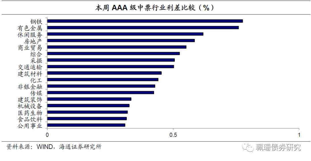 高等级债中,钢铁、有色金属是利差最高的两个行业。AAA级钢铁行业中票平均利差为78BP,AAA级有色金属行业中票平均利差为76BP。其次是休闲服务、房地产、商业贸易,其利差分别为62BP、58BP和55BP。公用事业是平均利差最低的行业,目前为31BP。![]()