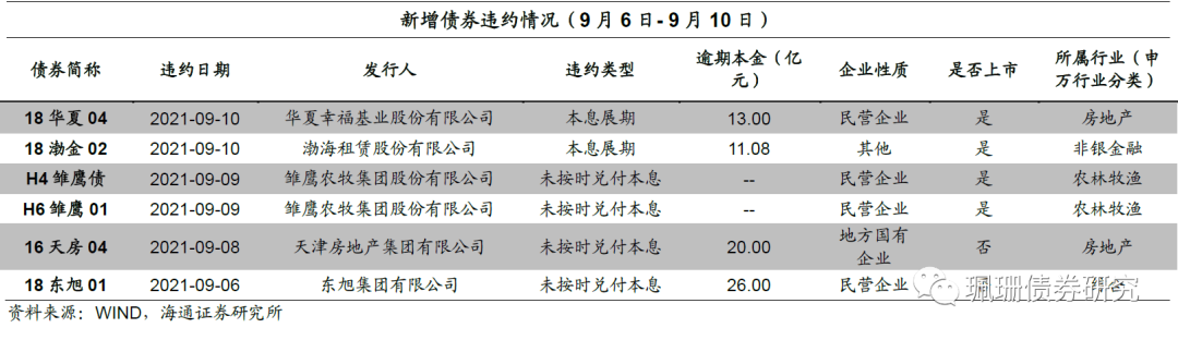 本周无信用债主体评级上调和下调,与上周相比,主体评级上调数量和下调数量均有所减少。本周新增违约债券6只,分别为18华夏04、18渤金02、H4雏鹰债、H6雏鹰01、16天房04、18东旭01。具体来看:18华夏04,违约本金13亿元,发行主体为华夏幸福基业股份有限公司,为民营企业,违约原因为在宏观经济环境、行业环境、信用环境叠加多轮疫情影响下,公司流动性出现阶段性紧张。18渤金02,违约本金11.08亿元,发行主体为渤海租赁股份有限公司,为其他企业,违约原因为受“新冠疫情”影响,发行人经营困难,根据其现金流情况及债务偿付安排,预计无法保障本金兑付,已开展展期工作安排。H4雏鹰债和H6雏鹰01,均未按时兑付本息,发行主体为雏鹰农牧集团股份有限公司,为民营企业,违约原因为公司目前资金周转困难。16天房04,违约本金20亿元,发行主体为天津房地产集团有限公司,为地方国有企业,违约原因为公司目前资金紧张。18东旭01,违约本金26亿元,发行主体为东旭集团有限公司,为民营企业,违约原因为公司流动性紧张。![]()