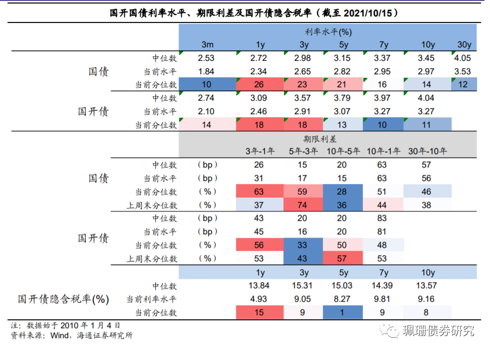 3M、30Y国债收益率仍低。从收益率绝对水平来看,3M、30Y国债利率均处于偏低位,分位数分别为10%、12%,其余关键期限国债利率均处于14%~26%分位数区间。相比于国债,国开债收益率所处分位数水平整体更低,均位于18%分位数及以下。国债期限利差大多收窄、国开债期限利差大多走阔。上周,10Y-1Y国债利差走阔4BP至63BP;3Y-1Y国债期限利差最陡,处于63%分位数;国开债曲线3Y-1Y期限利差最陡(处于56%分位数),10Y-5Y国开债期限利差比国债更为陡峭。隐含税率处于偏低水平。从隐含税率来看,10年期国开债隐含税率持续下行至9.2%,位于8%分位数,其余期限隐含税率所处分位数也整体偏低(均处于15%分位数及以下)。![]()