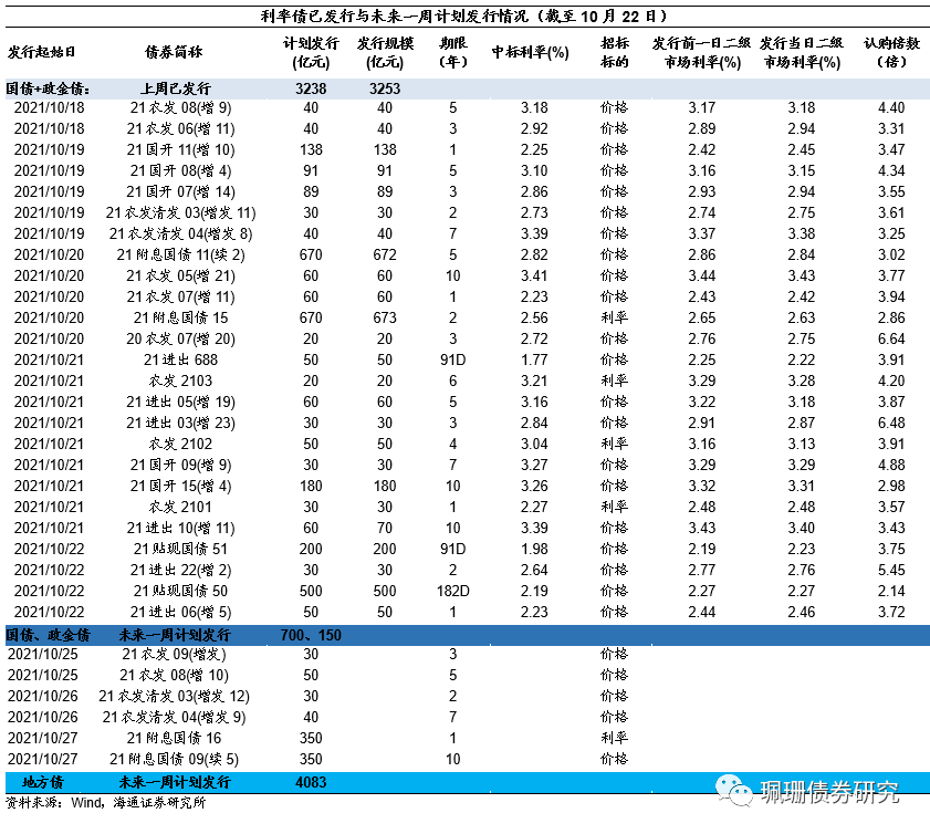 上周,利率债净供给3916亿元,环比增加2522亿元。总发行量6516亿元,环比增加2287亿元。其中,记账式国债发行2045亿元,环比减少77亿元;政金债发行1208亿元,环比增加128亿元;地方债发行3264亿元,环比增加2236亿元。截至10月22日,未来一周国债计划发行700亿元(较上周明显回落),地方债计划发行4083亿元(较上周大幅回升)、创今年以来最高周度发行规模和净融资规模。
