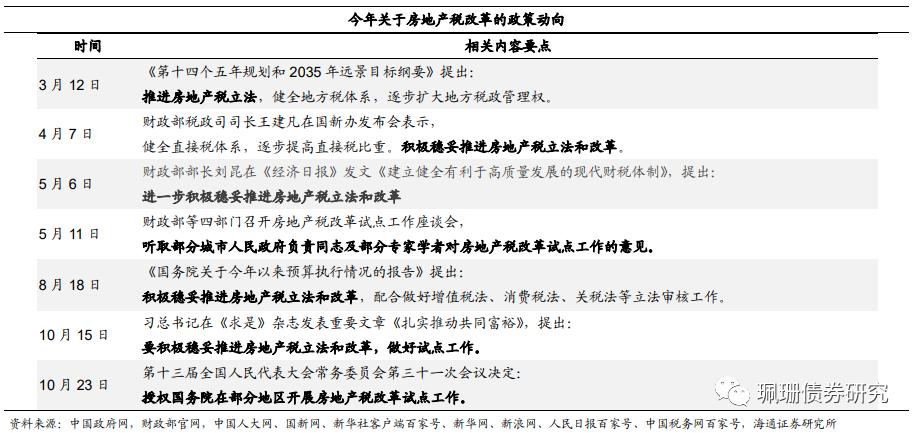 房地产税改革试点工作扬帆起航。2021年10月23日,新华网发布《全国人民代表大会常务委员会关于授权国务院在部分地区开展房地产税改革试点工作的决定》,内容提及授权国务院在部分地区开展房地产税改革试点工作。我们认为,区别于“房住不炒”方针,房地产税改革试点征收启动的目的并不是调控房价,而是与“共同富裕”大思路一脉相承的税收领域之延伸,房价涨势较为明显的城市可能被优先列为房地产税的试点城市。