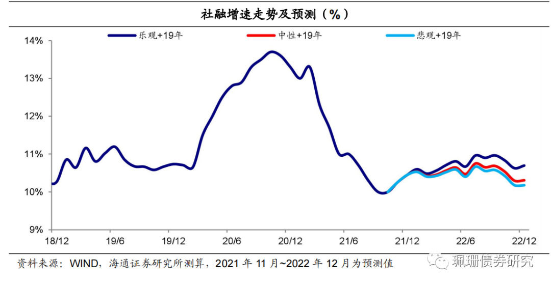 我们认为,仅从央行社融增速与名义GDP增速基本匹配的目标考虑,预计2022年社融增速先上后下、增速对应10.1~10.6%左右。从央行社融增速与名义GDP增速基本匹配的目标来看,2022年社融增速或在10.1%~10.6%左右。19年以来货币政策中介目标转为M2和社会融资规模增速与GDP名义增速基本匹配。19年2季度货币政策执行报告中,央行认为6月末社融存量增速(当时口径10.9%,下同)与名义GDP增速(8.3%)基本匹配,这意味着社融-名义GDP增速差的合意区间或在2.6%左右。央行论文《“十四五”期间我国潜在产出和增长动力的测算研究》显示2022年我国潜在GDP增速或为5.5%,IMF预测2022年我国GDP实际增速为5.6%,假设明年GDP平减指数为2%~2.5%,则2022年名义GDP增速或为7.5%~8 %,那么对应社融增速为10.1%~10.6%。此外,19Q3货币政策报告中表示9月末社会融资规模增速(10.8%)与前三季度名义GDP增速(7.6%)基本匹配并略高,这意味着在社融-GDP名义增速基本匹配的情况下,2022年社融增速大幅超过11%的可能性很小。![]()