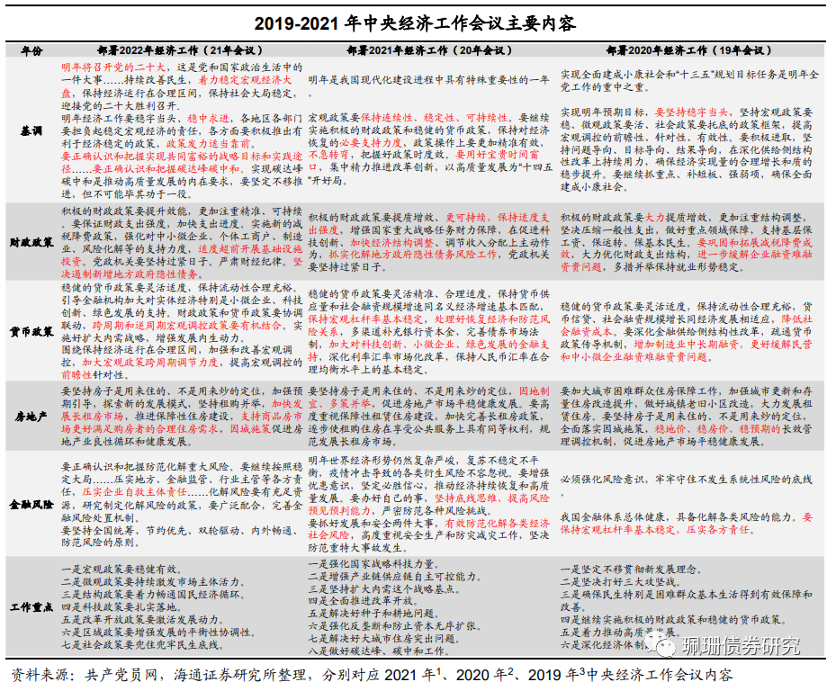 2022年政策基调:稳经济大盘,政策发力前倾、宽松力度更为积极。2021年中央经济工作会议表示“必须看到我国经济发展面临需求收缩、供给冲击、预期转弱三重压力”,政策定调为“明年将召开党的二十大…着力稳定宏观经济大盘,保持经济运行在合理区间,保持社会大局稳定,迎接党的二十大胜利召开”,以及“明年经济工作要稳字当头、稳中求进,各地区各部门要担负起稳定宏观经济的责任,各方面要积极推出有利于经济稳定的政策,政策发力适当靠前”。我们认为宽松政策更加积极、出台节奏或加速,政策窗口期或在上半年。