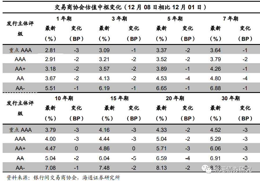 相比12月01日协会估值,本周(12月08日)信用债估值收益率下行为主。