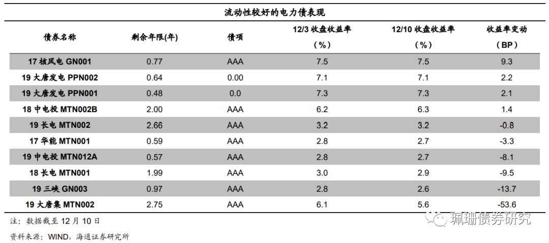本周我们观测的电力债样本中,代表性债券的收益率涨跌参半。具体来看,17核风电GN001上行9.3BP,19大唐发电PPN002上行2.2BP,19大唐发电PPN001上行2.1BP,18中电投MTN002B上行1.4BP,19长电MTN002下行0.8BP,17华能MTN001下行3.3BP,19中电投MTN012A下行8.1BP,18长电MTN001下行9.5BP,19三峡GN003下行13.7BP,19大唐集MTN002下行53.6BP。