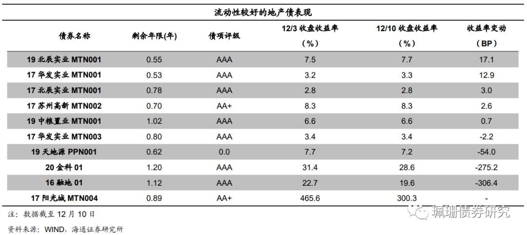 本周我们观察的地产债样本中,代表性债券的收益率上行为主。具体来看,19北辰实业MTN001上行17.1BP,17华发实业MTN001上行12.9BP,17北辰实业MTN001上行3BP,17苏州高新MTN002上行2.6BP,19中粮置业MTN001上行0.7BP,17华发实业MTN003下行2.2BP,19天地源PPN001下行54BP,20金科01下行275.2BP,16融地01下行306.4BP,17阳光城MTN004异常变动。