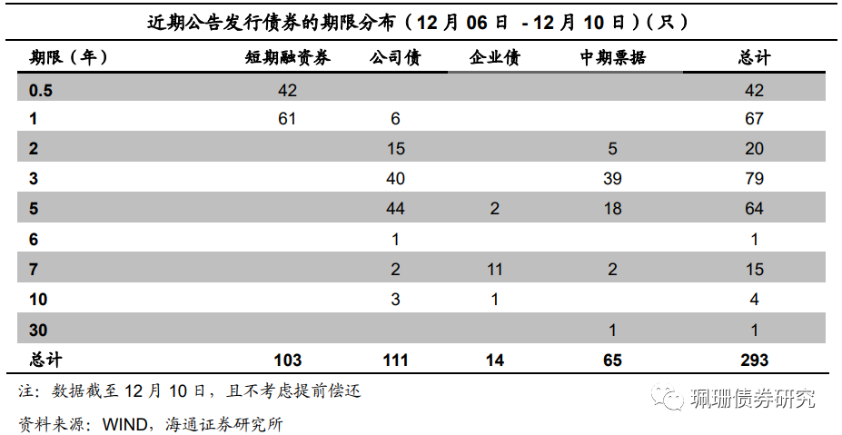 根据Wind统计,本周短融发行928.5亿元,到期877.4亿元,中票发行619.3亿元,到期515.3亿元;企业债发行90.2亿元,到期172.4亿元;公司债发行963.8亿元,到期466.9亿元。本周主要信用债品种共发行2601.8亿元,到期2032.0亿元,净供给569.86亿元,较前一个交易周(11月29日-12月03日)的720.46亿元有所减少。