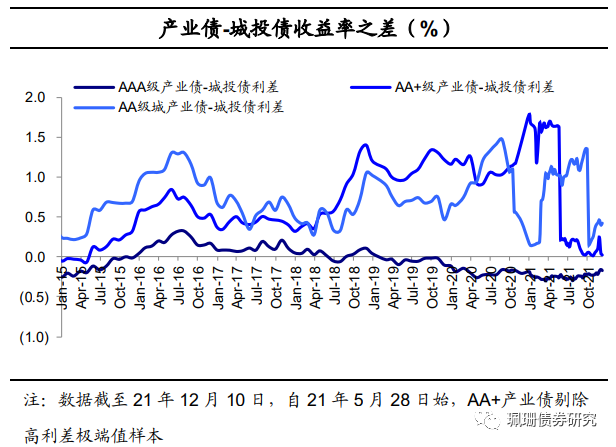 产业债与城投债利差分化。具体来看,截至12月10日,本周AAA级产业债-城投债利差目前在-17BP,较前一交易周末下行1BP;AA+级产业债-城投债利差目前在2BP左右,较前一交易周末下行2BP;AA级产业债-城投债利差目前在42BP左右,较前一交易周末上行2BP。