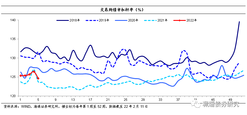 分机构来看杠杆率整体上行,券商、基金、保险环比同比均加杠杆。(6)从交易所债市托管量/回购余额来看,上周交易所杠杆率环比下行、而同比上行。至2月11日当周交易所债市杠杆率为125%,环比继续下行1.8个百分点,而同比上行0.9个百分点、仅高于21年同期水平。