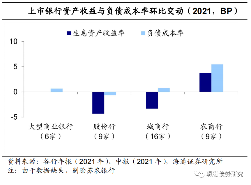 生息资产结构中,除农商行外整体稳定,各项环比变动幅度均不超1个百分点。其中,贷款占比均提高,债券投资占比分化、同业资产占比整体小幅下降。从2021年上市银行的生息资产结构变化看,上市银行贷款占比普遍提高,其中农商提升幅度最大,为1.5pct。债券投资占比变动分化,其中大行和股份行变化不大,城商行增加0.8pct,农商行减少1.9pct。同业资产占比整体小幅下降,除股份行小幅上升0.1pct外,大行、城商行和农商行分别小幅下降0.4pct、0.1pct、0.1pct。