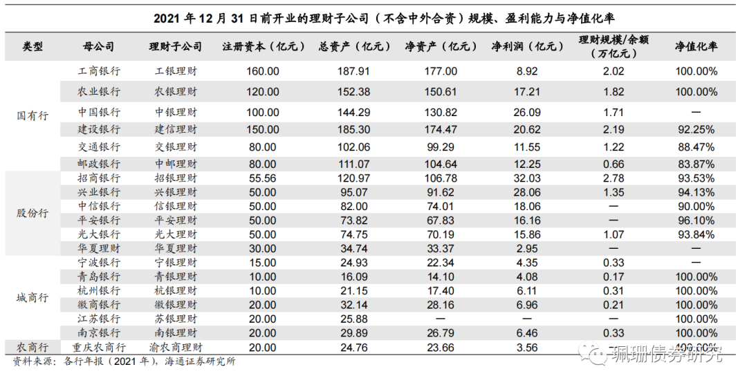 理财子公司:净值化率普升,规模增速大幅提升。从盈利能力来看,2021年除苏银理财未公布净利润数据外,其余净利润均为正。净值化产品占比提升,理财规模同比大幅增长,结构上以固收类产品为主。