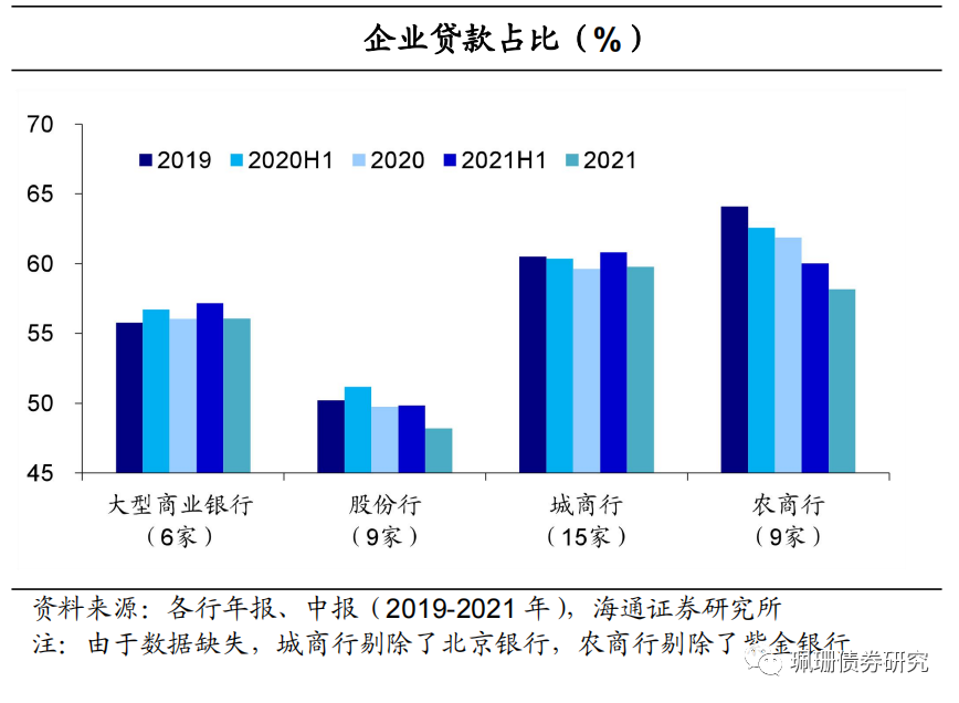 2021年各类银行房地产行业贷款和企业贷款占比均下降。与2021H1相比各类银行的个人住房贷款占比除大行略升0.5pct外其余波动幅度较小;房地产行业贷款占比均小幅下降,降幅在0.3-0.8pct;企业贷款占比均下降明显,降幅在1.0-1.9pct,其中股份行和农商行降幅最大,分别下降了1.6pct、1.9pct。