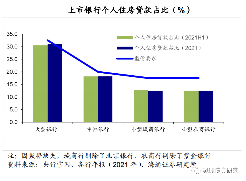 房贷集中度达标情况:略有改善。20年12月31日,中国人民银行、中国银行保险监督管理委员会发布《关于建立银行业金融机构房地产贷款集中度管理制度的通知》,分五档对房地产贷款集中度进行管理,并分档设置房地产贷款余额占比和个人住房贷款余额占比两个上限。相较于21年H1,39 家上市银行中,个人住房贷款占比超出警戒线的银行从10家下降为9家(重庆农商银行达标),房地产贷款占比超出警戒线的银行仍为8家,但过线幅度普遍下降(未剔除住房租赁有关贷款,因此数据偏高)。