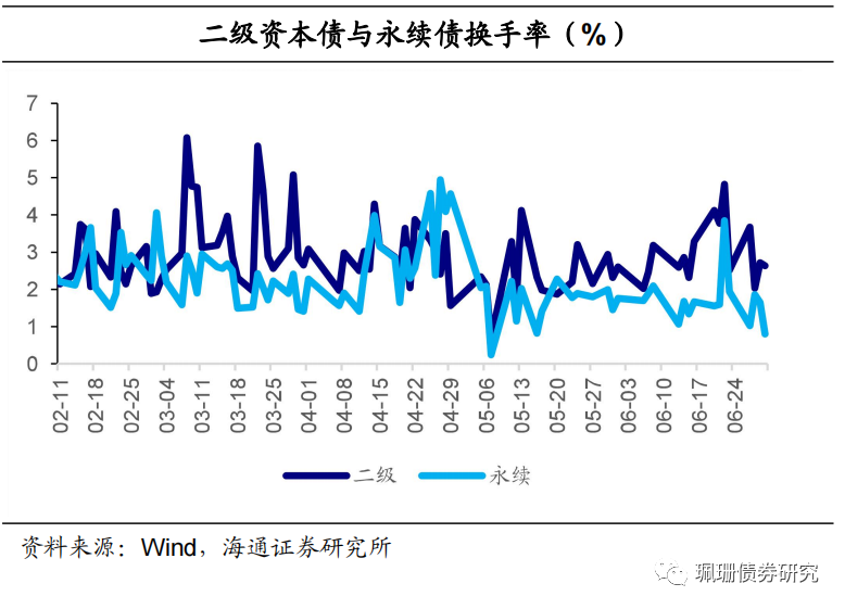永续债和二级资本债收益率整体下行,低等级收益率下行幅度更大。6月后半月,二级资本债和永续债收益率整体下行(相较于6月15日),二级资本债方面,5年期AAA-、AA+收益率略有下行,AA收益率小幅上行3.5bp,AA-、A+和A等级收益率下行幅度在9.4~11.5bp区间内;3年期各等级收益率均下行,低等级收益率下行幅度更大。永续债方面,5年期各等级收益率下行幅度在2.8~13.8BP区间内,低等级下行幅度更大;3年期AAA-和AA+收益率略有上行。