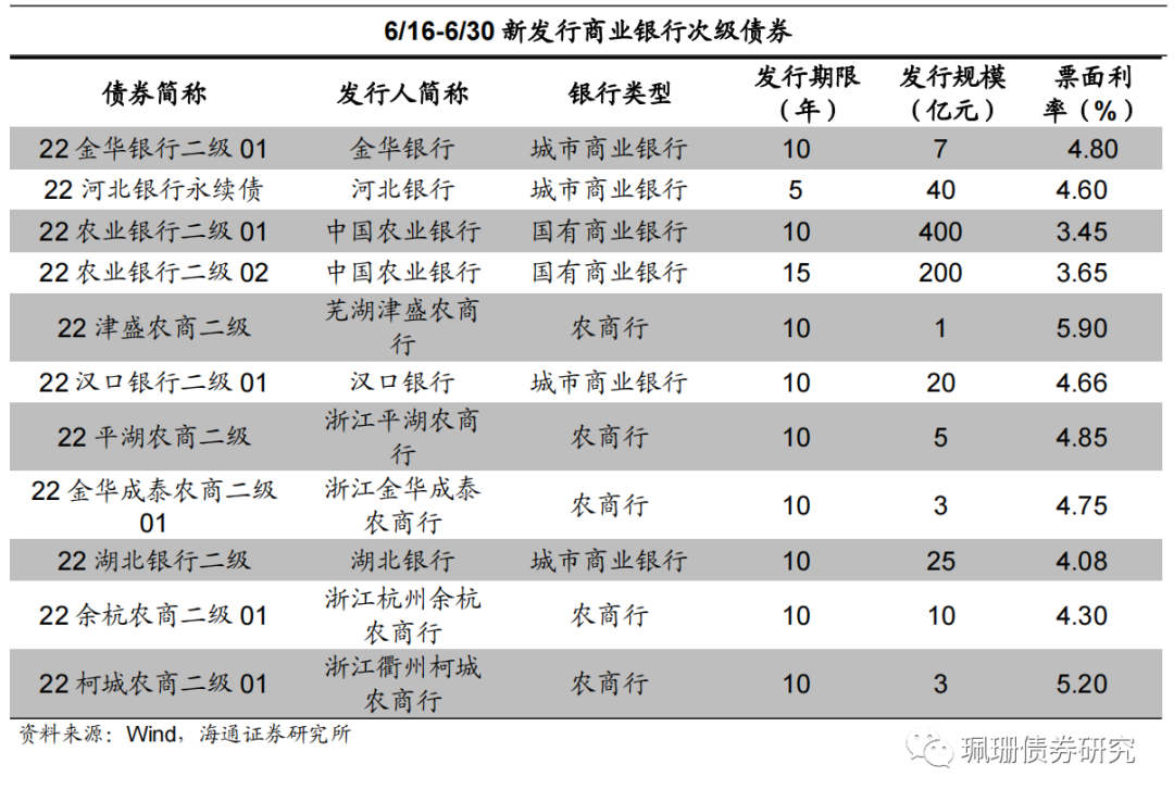 6月16日至6月30日,证券公司次级债共发行5只,总规模为167.5亿元,较前一统计周期环比增加137.5亿元;保险资本补充债共发行2只,总规模为41亿元。