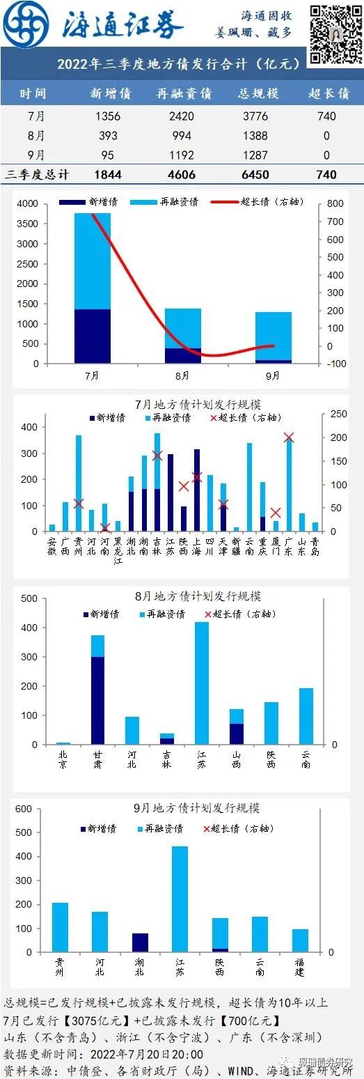 截至7月20日,7月地方债已发行3075亿元(其中超长债494亿元),已披露未发行规模700亿元(含超长债246亿元)。