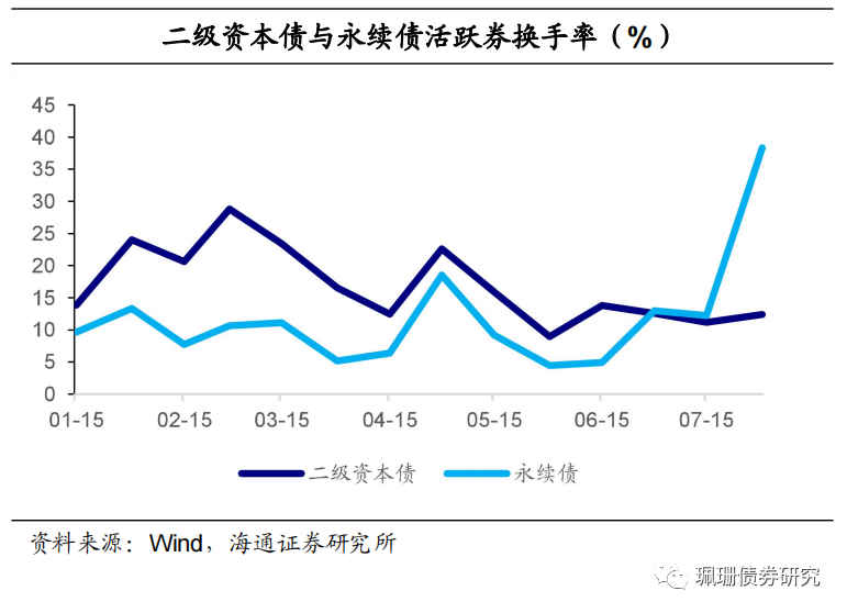 二级成交:收益率继续大幅下行。二级资本债和永续债成交额双双回落,7月后半月,商业银行次级债券成交额合计3577亿元。其中,二级资本债成交额为2297.79亿元,较前一统计周期环比减少195.79亿元;永续债成交额为1279.21亿元,较前一统计周期环比减少41.97亿元。永续债和二级资本债收益率继续大幅下行,低等级收益率下行幅度更大;日均换手率、活跃券日均换手率均大幅上升。