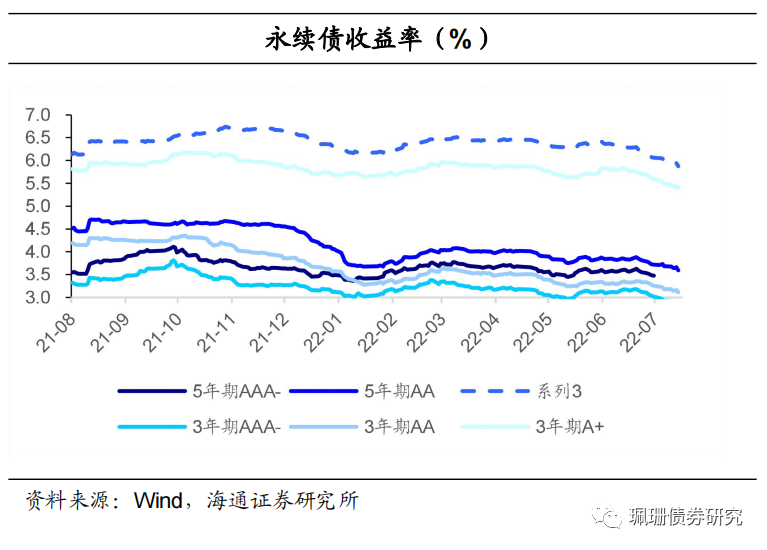 永续债和二级资本债收益率继续大幅下行,低等级收益率下行幅度更大,位于一年以来最低位附近。7月后半月,二级资本债和永续债收益率继续下行(相较于7月15日),二级资本债方面,5年期和3年期AAA-、AA+、AA收益率下行幅度在12bp~16bp之间,AA-、A+和A等级收益率下行幅度在16bp~22bp之间。永续债方面,5年期和3年期各等级收益率下行14bp~20bp。