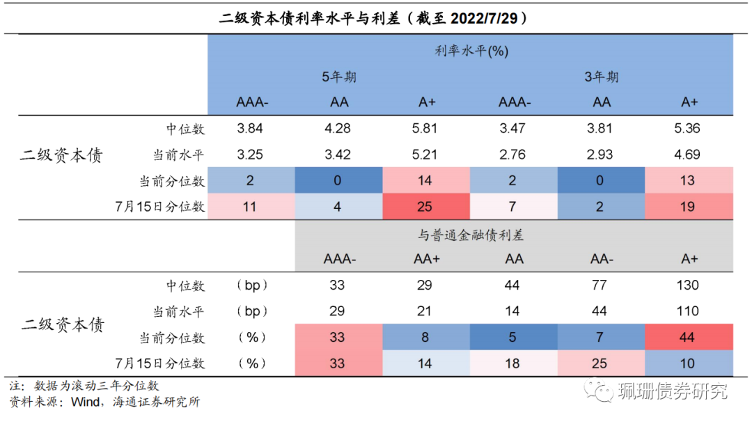 利差走势:利差继续收窄。7月前半月,二级资本债、永续债与国开债、普通金融债利差继续收窄,低等级收窄更为明显;永续债与二级资本债利差继续收窄。